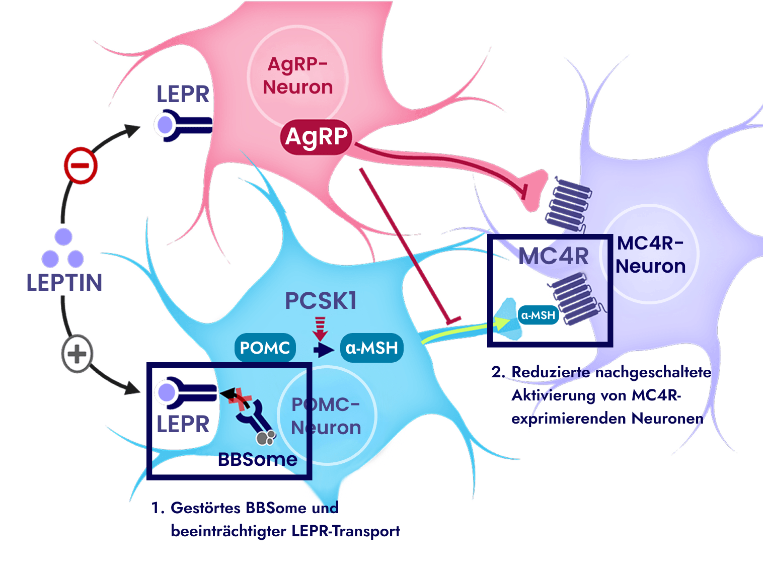 Erfahren Sie mehr über den Mechanismus des MC4R-Signalwegs und darüber, wie dessen Beeinträchtigung zu BBS und damit einhergehender Hyperphagie und frühkindlicher Adipositas führen kann.
